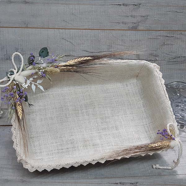 La decoración le puedes pedir, las tonalidades de lazos y las flores que decoran la bandeja sean del color que tú necesitas, la cesta para llevar los pétalos de boda, son imprescindibles en tu boda. Está decorada con flores secas y preservadas.